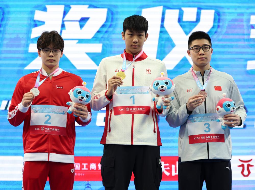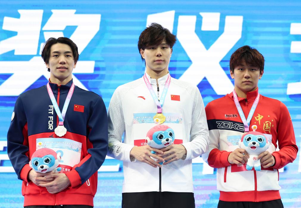 覃陸地(中)、孫佳俊(左)和董志豪在男人100米蛙泳項目頒獎典禮上合影。新華社記者 雒圓 攝