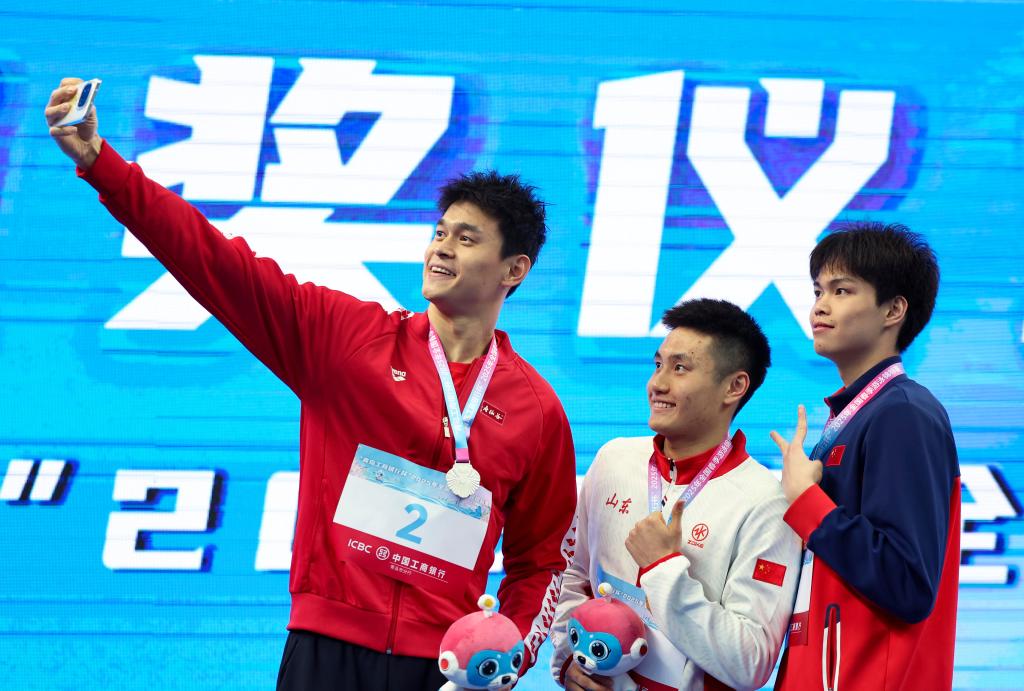 孫楊(左)、劉培鑫(中)和徐海博在頒獎典禮上自拍合影。新華社記者 雒圓 攝