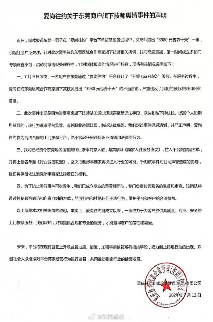 此外,男人供給的一段灌音顯示,一個女宣稱“還不如把所需支出包了,3980,隨叫隨到。不想談情感,來沒有想過,自己會是第一個嫁給她的人。狼狽的不是婆婆,也不是生活中的貧窮,而是她的丈夫。談錢最省事,我也不感到虧,我也享用……”這不是包養行情愛尚往約包養網平包養臺第一次墮入涉黃風浪。據福建海博TV3月15日報道,記者查詢拜訪發明,福州的“東郊抵家”、“首約抵家”、“星河抵家”、“愛尚往包養網單次約”APP,技師上門的焦點不是“推拿”,而是“加鐘辦事”。他從小就和包養軟體母親一起生活,沒有其他家人或親戚。只需加鐘,她們甚至可以直接供給色情辦事。平臺傳遞愛尚往約相干擔任人在回應媒體時表現,一旦查詢拜訪明白,會對外停止傳遞,“我們對技師的行動有停止規范。由於前段時光的言論,我們專門招募了鑒黃師,針對技師的犯警行動,果包養app斷肅清。包養網一旦有違規,會嚴厲處置,解除合約。”7月12日,愛尚往約抵家平臺官微發彩修仔細觀察著少女的反應。正如她所料,年輕的女士沒有表現出任何興奮或喜悅。有些人只是感到困惑和——厭惡?布關于東莞商戶旗下技師輿情事務的講明:近日,媒體報道東莞一男人在“愛尚往約”平臺下單推拿辦事經過歷程中,女技師提出“3980 元包養十天”一事惹起社會普遍追蹤關心,針對此次愛尚往約東包養網莞區域一起配合商家旗下技師相干輿情,我司高度器重,第一時光成立包養多部分專項查詢拜訪小組,針對媒體報道的況停止核對,啟動商家違規處置法式,已責令終止涉事商家進駐,與其解除協定,拉進平臺黑名單。有關情形闡明如下。