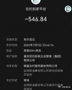 男人7月9日23點包養管道46分的付款截圖顯示,商品名“芬芳spa+熱灸”,商戶名為重慶往約抵家企業治理(團體)無限公司,付款546.84元,圖上還有訂單編號。