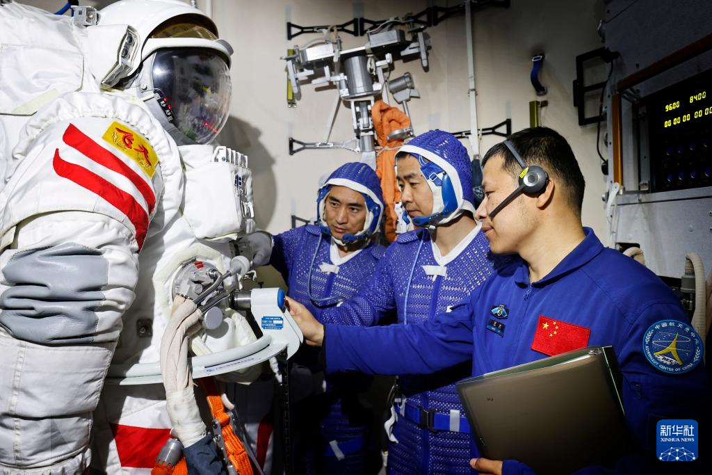 神船二十號航天員乘組在停止出艙法式練習(2025年1月9日攝)。新華社發(徐部 攝)